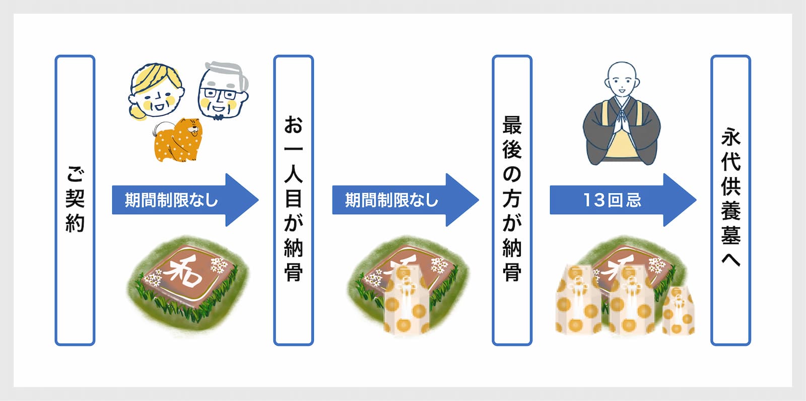 ご納骨後は寺院様により供養していただきます。13回忌には合同供養墓に納骨され、永代に渡り供養していただくので安心です。