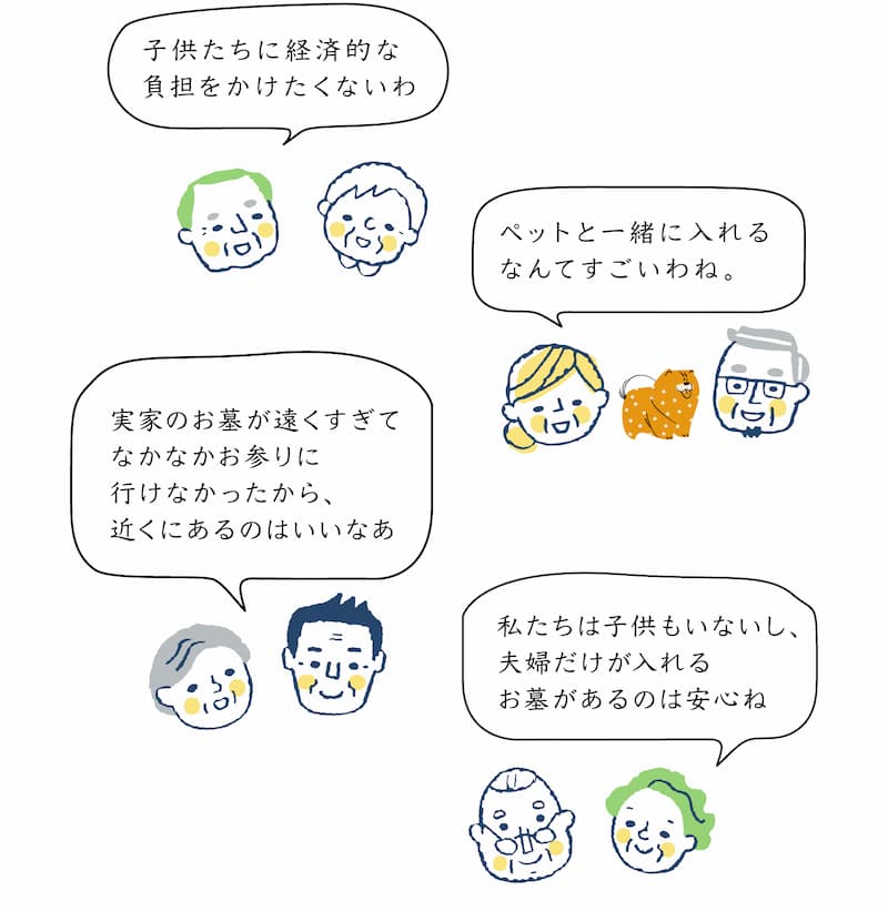 私は独身で家族がいません。実家は遠方にありそちらに先祖代々の墓もあるのですが、これから実家のお墓をどうしていこうか一人悩んでいました。ある日、チラシが目に留まって一人でも入れるお墓があることを知りました。またお墓の引越しもやってくれるとのことですぐに電話をかけました。金額のこと、墓じまいのこと、色々話を聞いてもらって気持ちが楽になりました。(70代男性)